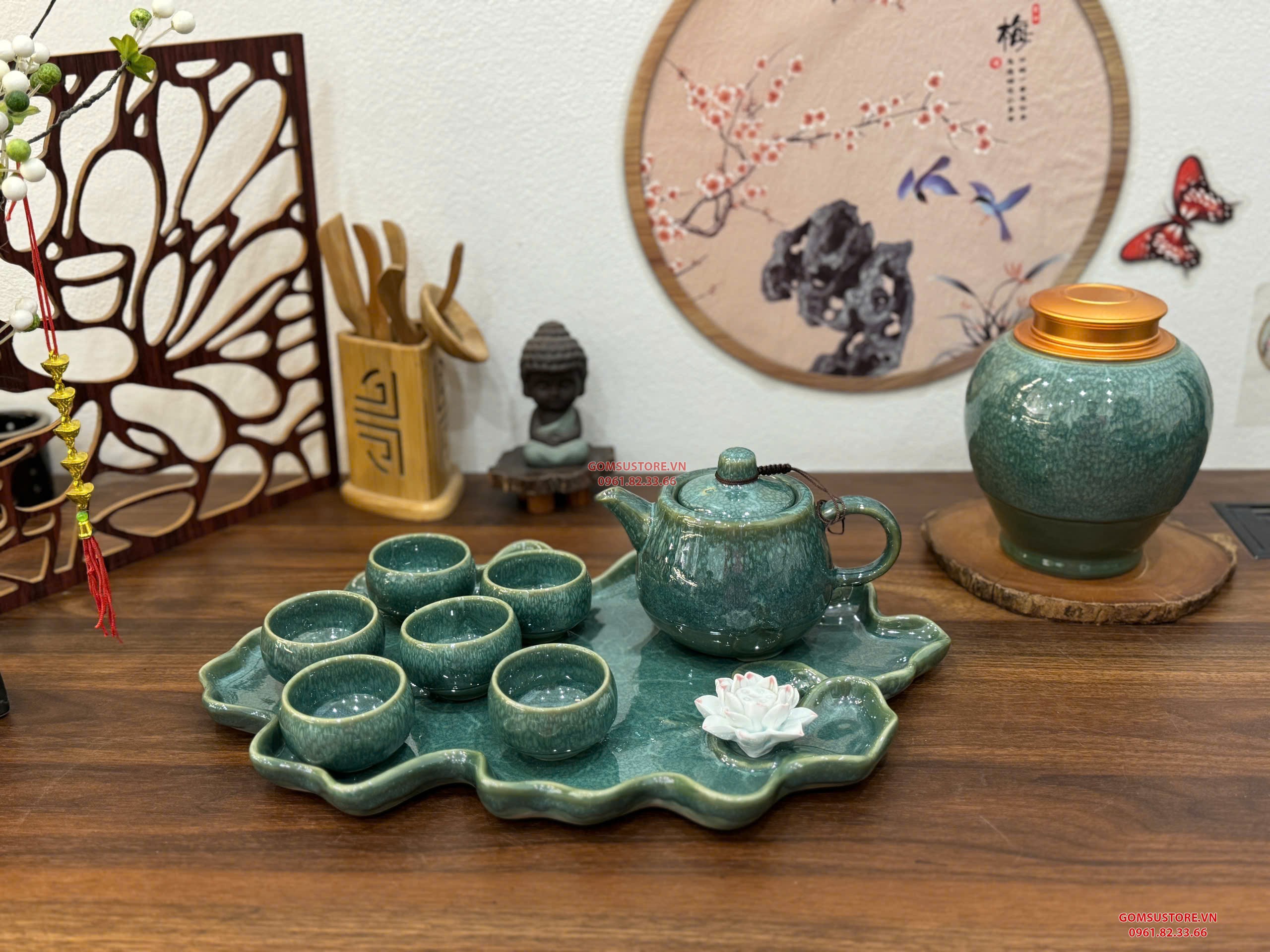 Bộ gồm: 1 ấm trà, 6 chén nhỏ, 1 khay sen hoặc khay tròn