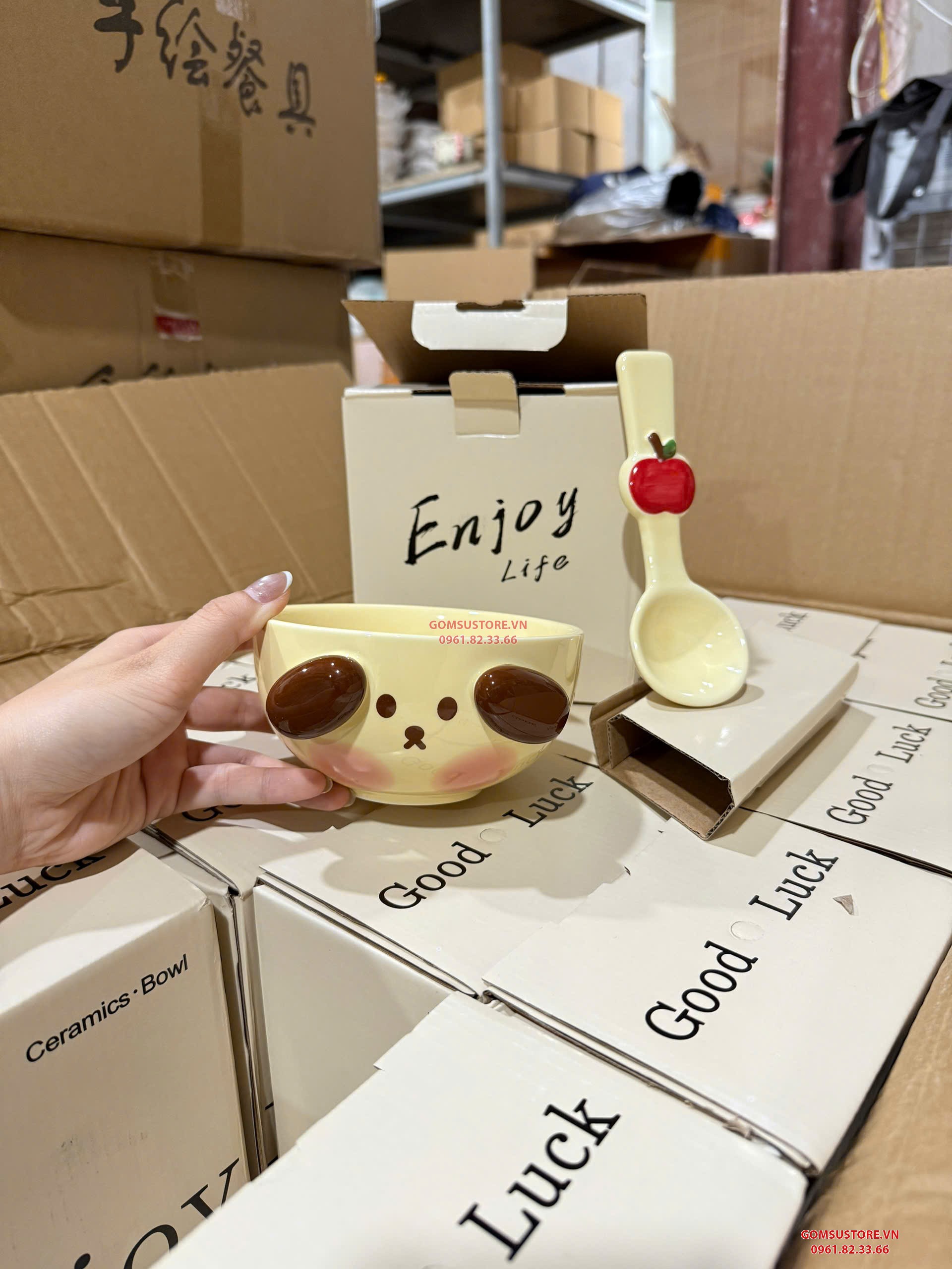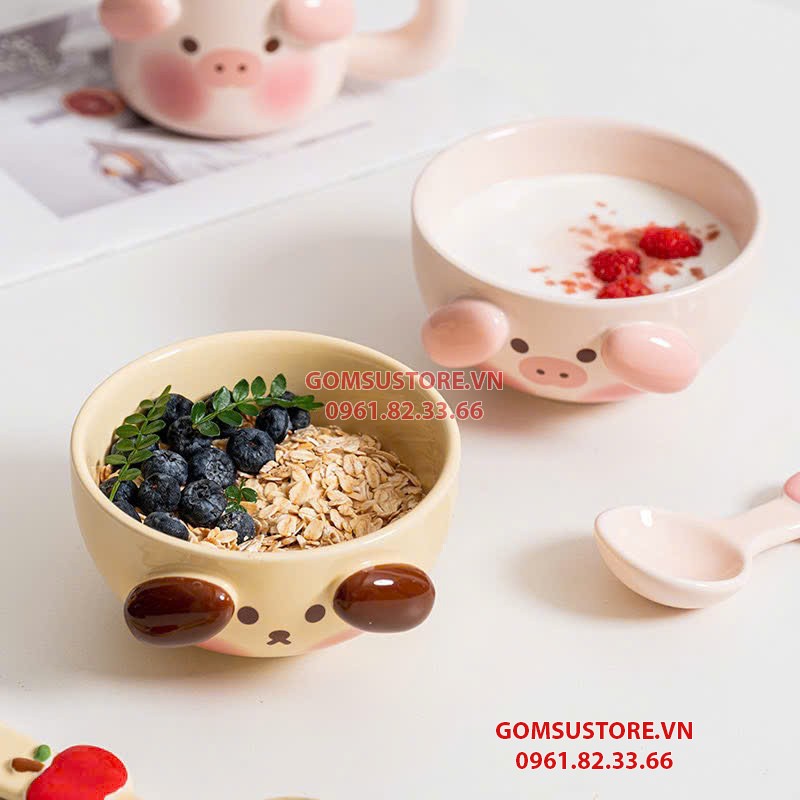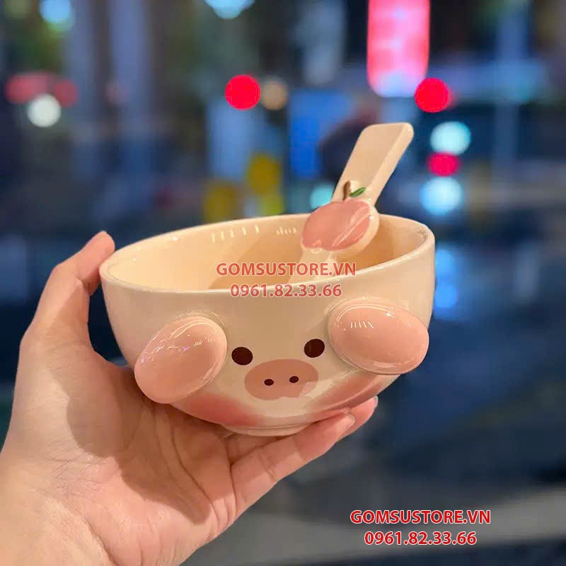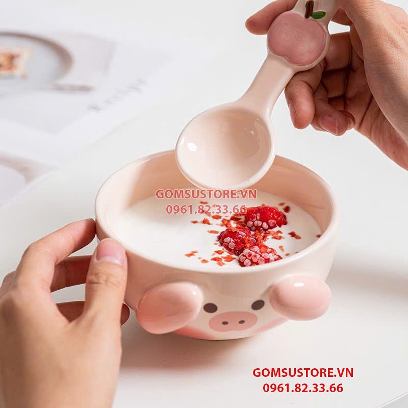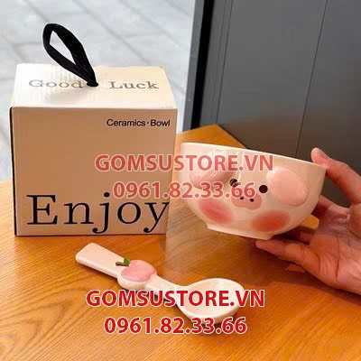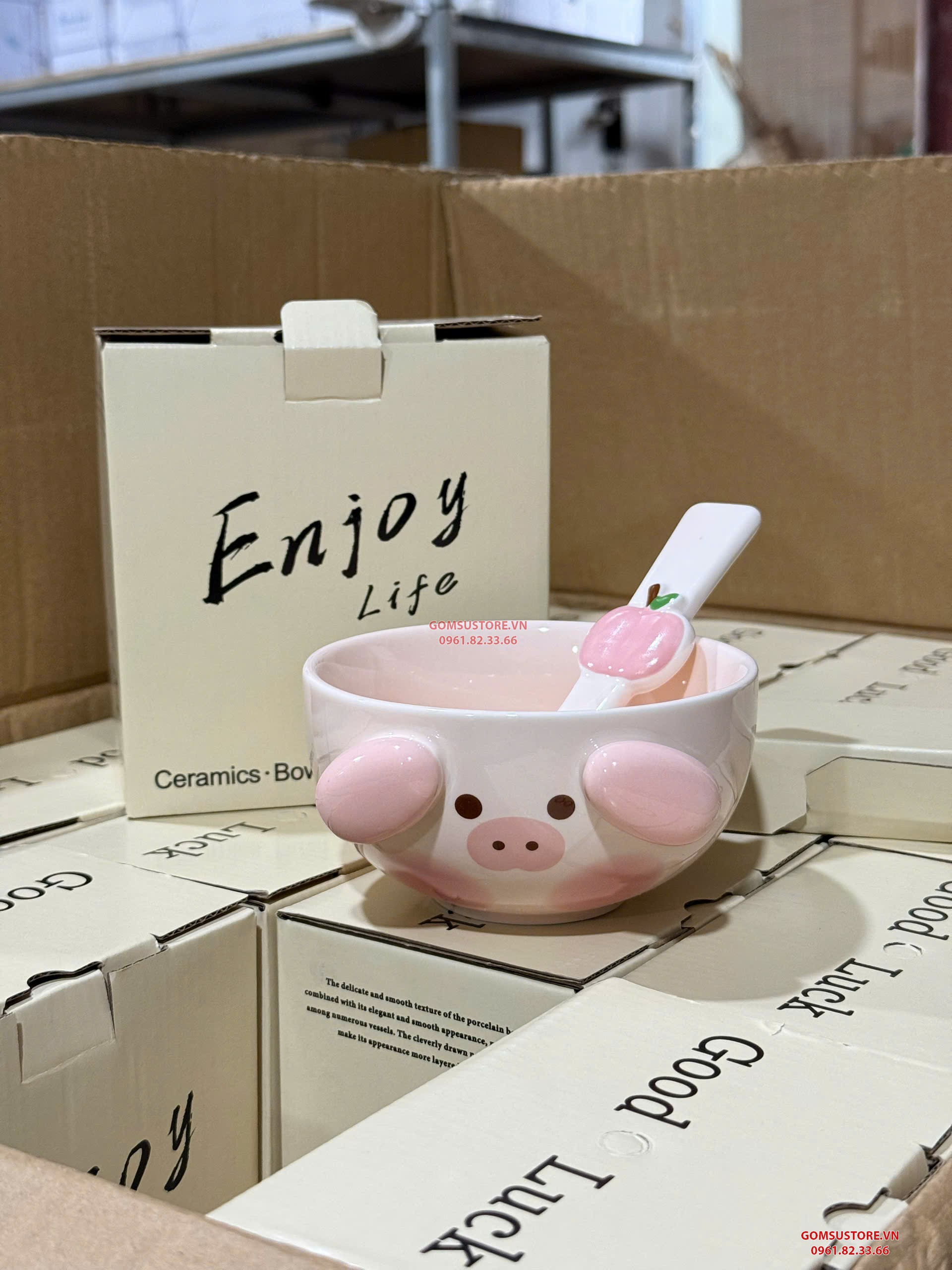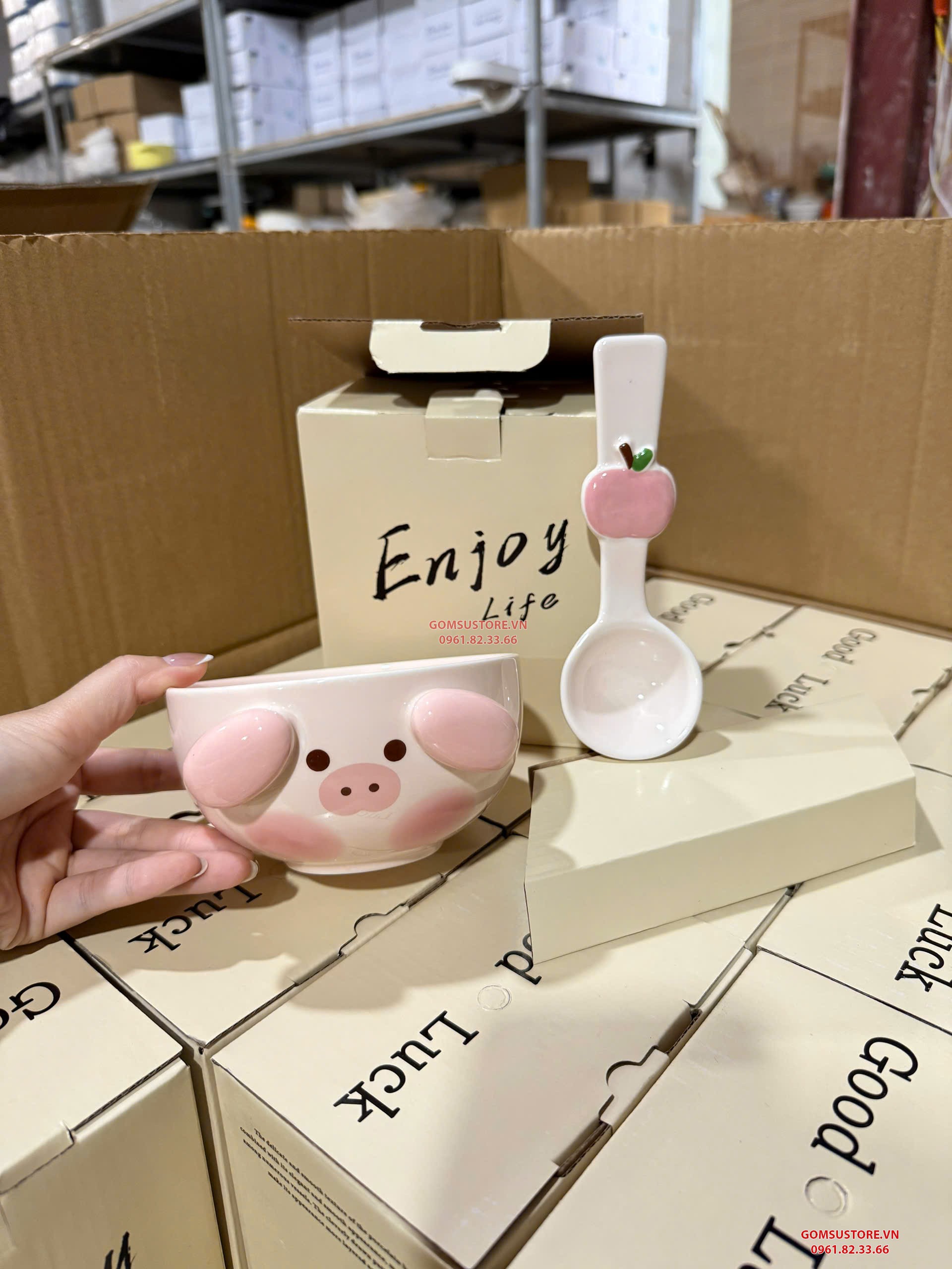 Set bát heo hồng cún vàng kèm thìa hộp quà 12.3cm x 7.6cm dung tích 500ml