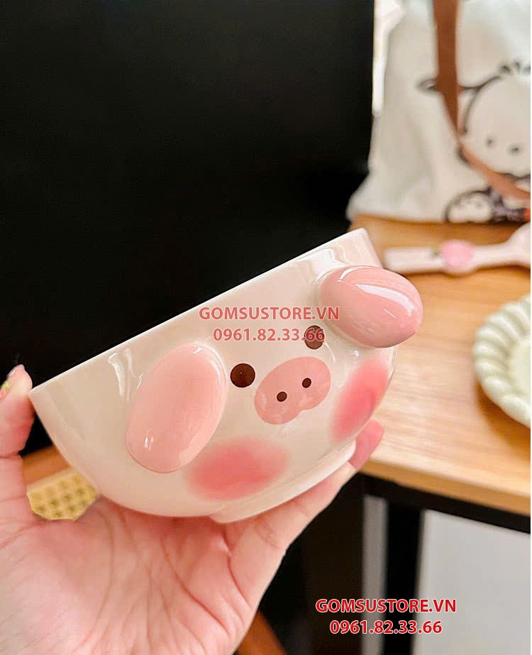Cốc heo hồng dễ thương với chiếc mũi tròn hồng nhạt, đôi tai nhỏ nhắn và nụ cười ngộ nghĩnh, mang lại cảm giác vui tươi, gần gũi.